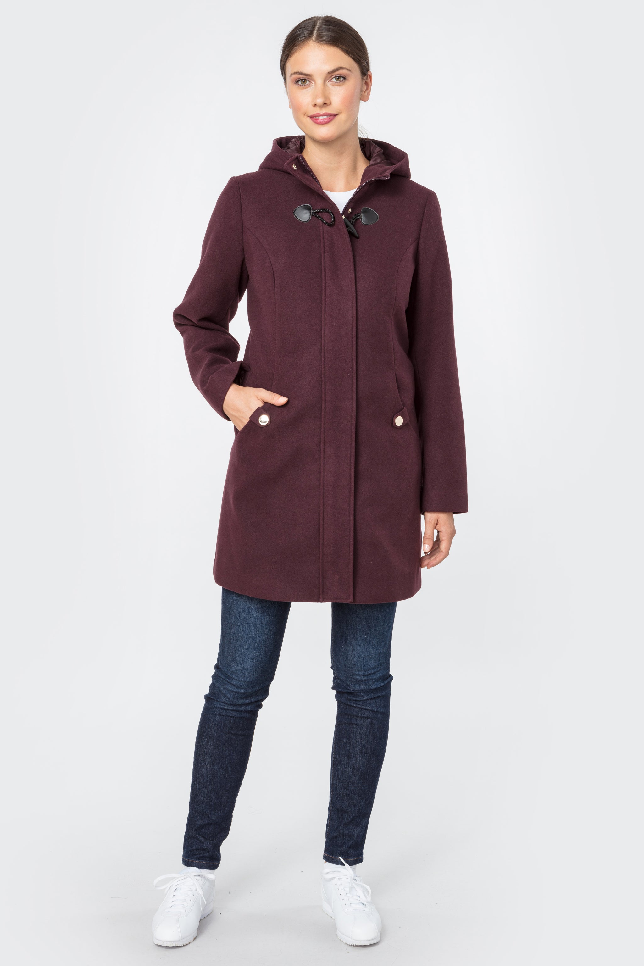 A zip front hooded wool car coat with hood.
