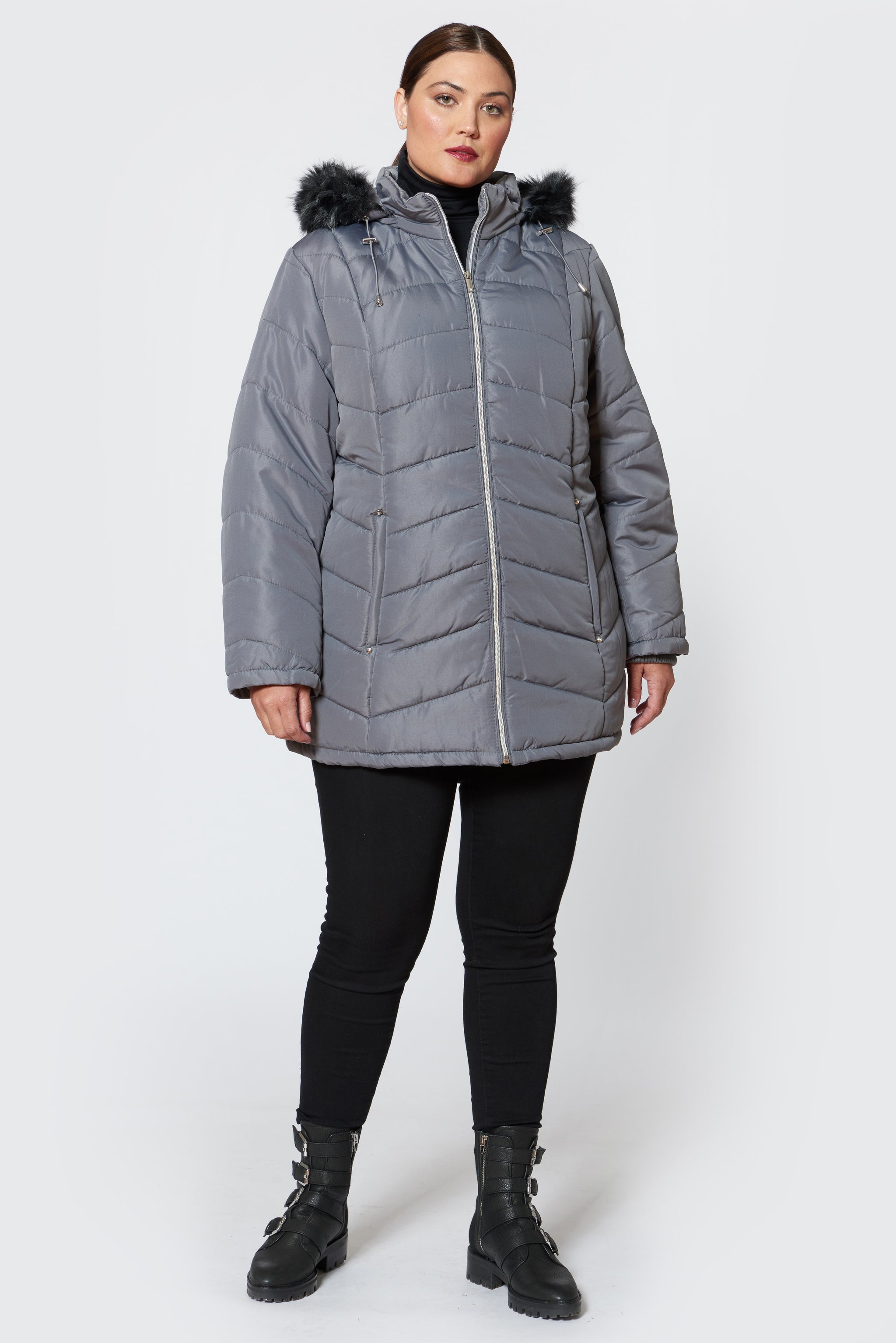 Plus size zip front puffer with faux fur trim hood.